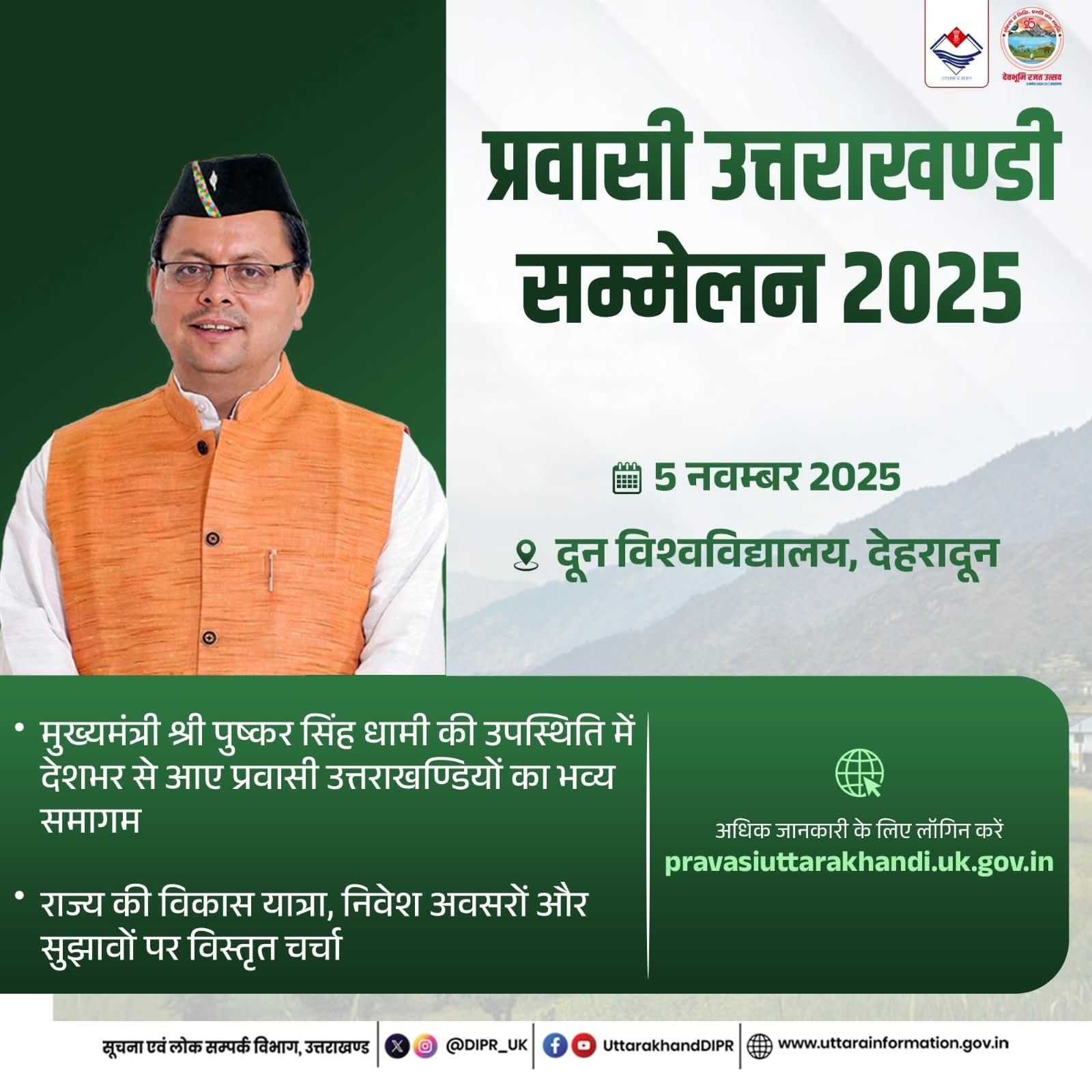 आगामी 5 नवम्बर को दून विश्वविद्यालय, देहरादून में आयोजित प्रवासी उत्तराखण्डी सम्मेलन 2025 में मुख्यमंत्री श्री पुष्कर सिंह धामी करेंगे प्रवासियों के साथ सीधा संवाद।