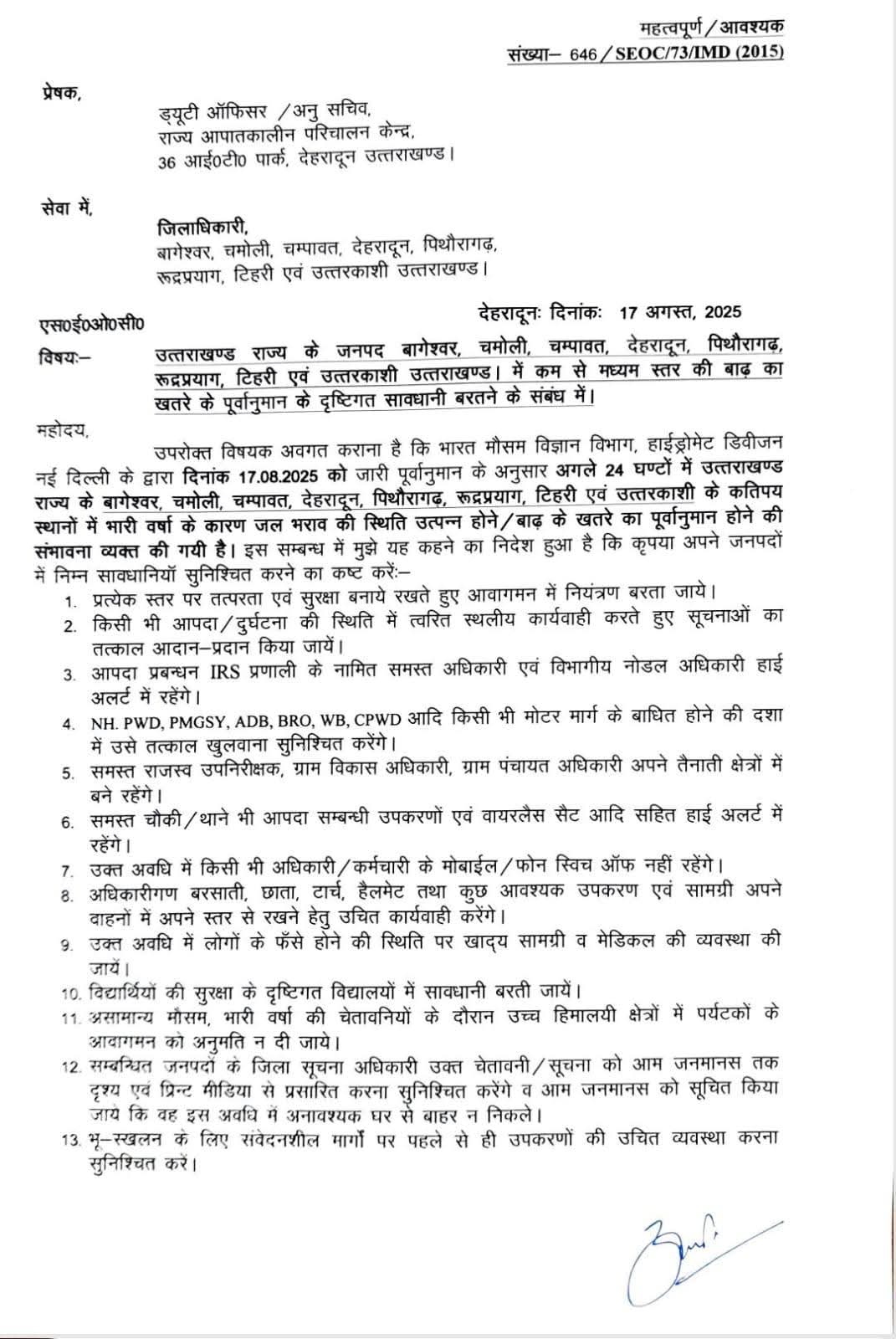 मुख्यमंत्री श्री पुष्कर सिंह धामी ने आज वर्चुअल बैठक कर सभी जिलाधिकारियों को निर्देश दिए कि प्रदेश में लगातार हो रही वर्षा के दृष्टिगत वे अपनी पूरी टीम के साथ लगातार ग्राउंड ज़ीरो पर रहें। मुख्यमंत्री ने निर्देश दिए कि अतिवृष्टि के कारण सड़कों के बाधित होने की स्थिति में उन्हें शीघ्र सुचारु किया जाए। पेयजल और विद्युत की लाइनें क्षतिग्रस्त होने की स्थिति में यथाशीघ्र सुचारु की जाएं।